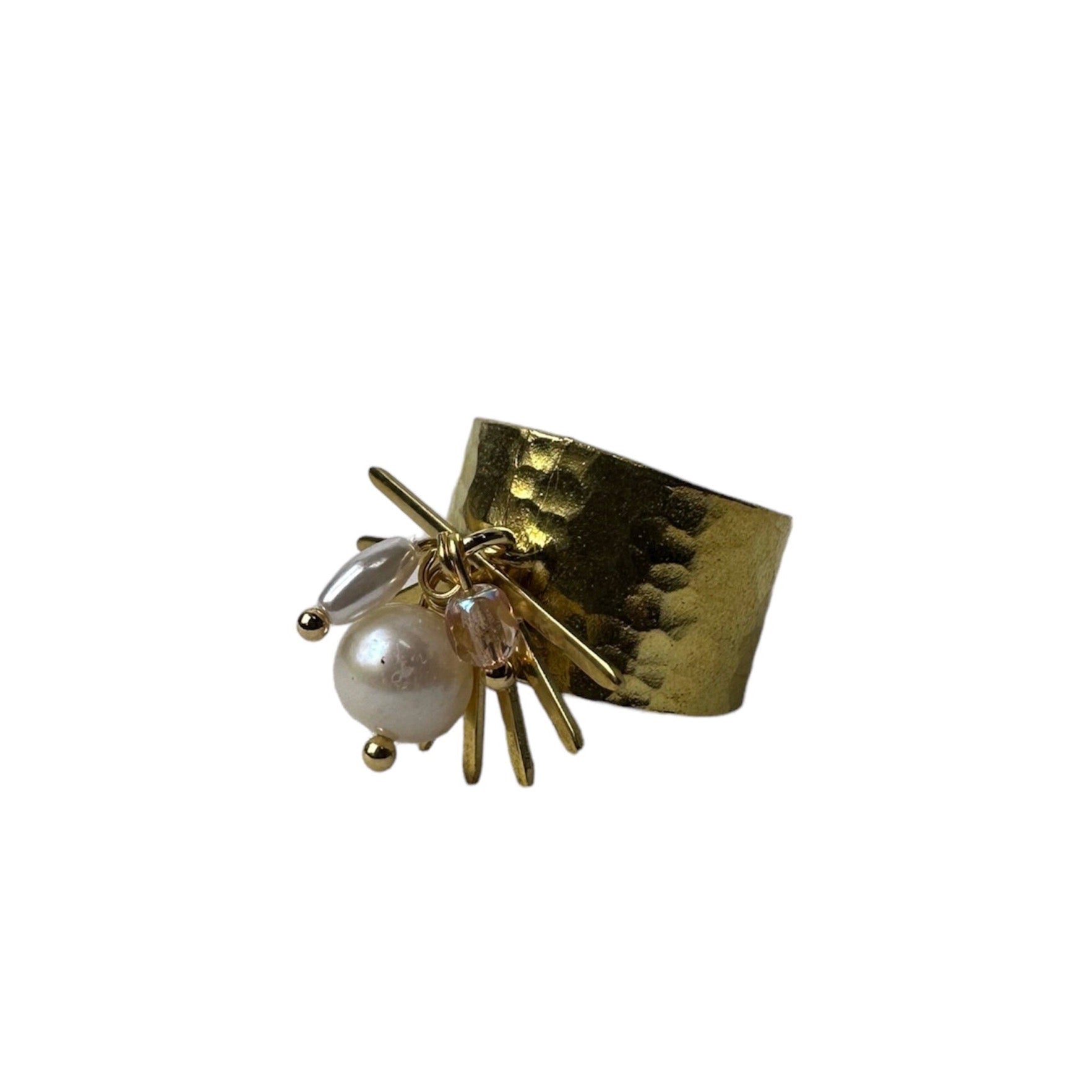 Slightly Adjustable, textured hammer brass ring with natural pearls and sunbeam charm.