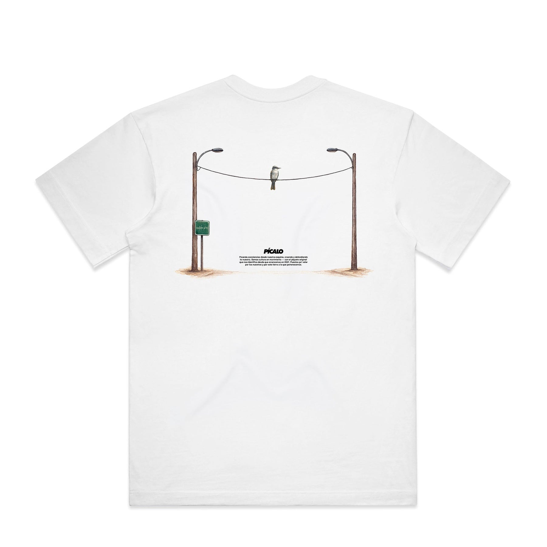 El diseño muestra al pitirre posado sobre los cables del tendido eléctrico — observando, velando, resistiendo.